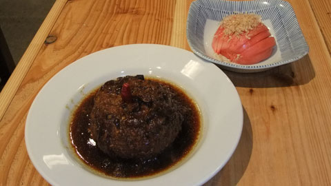 「バクダン」は際らしい真っ黒な丸いインパクトあるミートボールで、「ももたろう」という一見トマトに見えるさっぱりした玉葱の酸っぱい漬物と一緒に頼むと相性がいい。