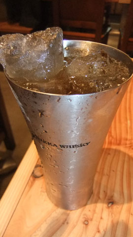お酒は、マイナス2度にまで冷やした状態で専用サーバから提供される、ニッカのウイスキーを使用した「エベレストハイボール」。氷も専用の金属グラスに、かち割り氷が山盛りに入れられ、非常にインパクトあるハイボールになっている。このような提供法は初めてで、ハイボールの新しい飲み方として注目される。